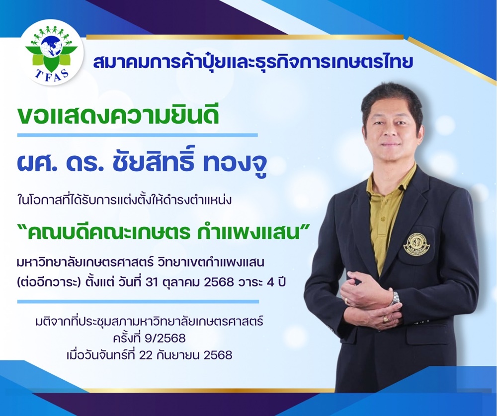 สมาคมการค้าปุ๋ยและธุรกิจการเกษตรไทย ขอแสดงความยินดีอย่างยิ่งกับ ผศ.ดร. ชัยสิทธิ์ ทองจู ในโอกาสที่ได้รับการแต่งตั้งให้ดำรงตำแหน่ง คณบดีคณะเกษตร กำแพงแสน มหาวิทยาลัยเกษตรศาสตร์ วิทยาเขตกำแพงแสน